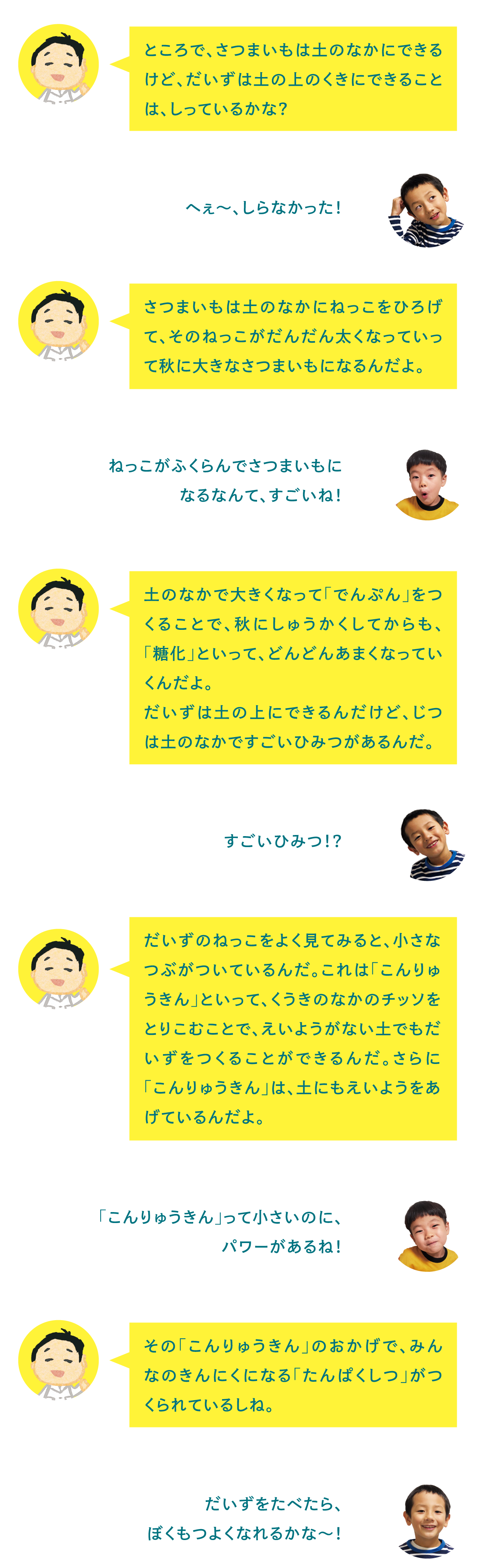さつまいもは土のなかで「でんぷん」をつくっています。「でんぷん」は、エネルギー(うごく力(ちから))になります。いっぽう、きんにくとなる「たんぱくしつ」をつくっているのは、だいずです。