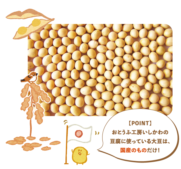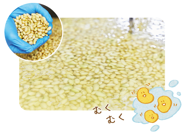 ブレンドされた国産の大豆は、夏8時間~冬14時間水に浸して2.2倍のサイズに! ふっくらとした楕円形になります。