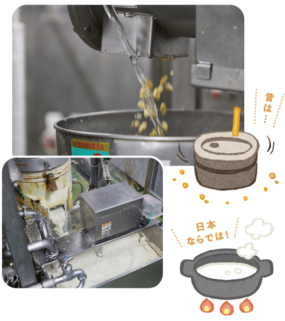 一度煮ることで殺菌し、大豆に含まれる毒素と匂いを取り除きます。実はこれ、豆腐を生で食べる日本ならではの製法。中国式製法は豆乳とおからに分離させてから加熱します。