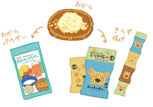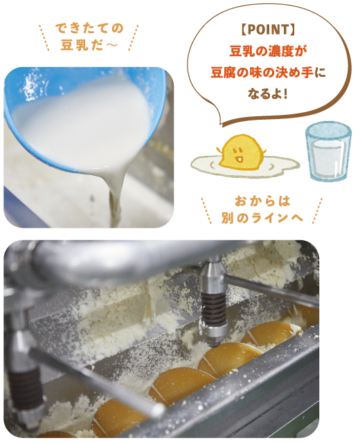 殺菌した生呉は火を通し、豆乳とおからに分けられます。豆乳は豆腐・油あげなどそれぞれのラインへ。おからは、おからパウダーやきらず揚げへと姿を変えて、いしかわの商品にラインナップ!