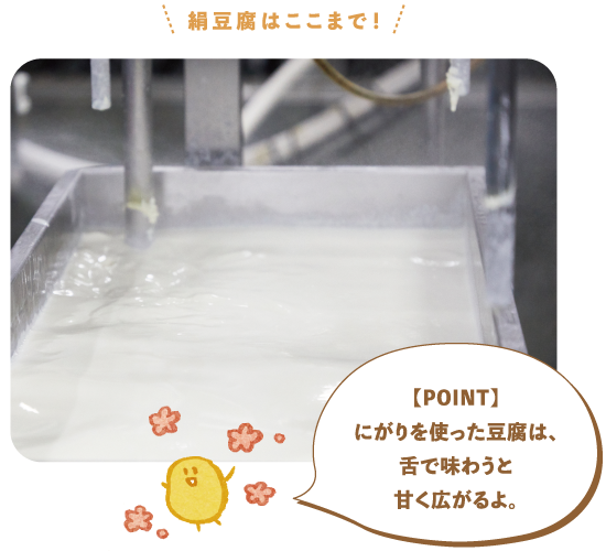 型に入れた豆乳ににがりを打ちます(打つとは、加えて混ぜること)。にがりを打ってから3秒後には豆乳が固まり出すというから驚き!素早く均一にかき混ぜるというのが職人技なんですね。