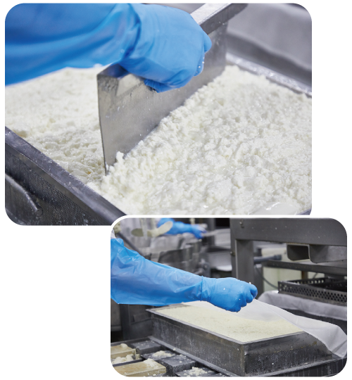 木綿豆腐は一度固めた豆腐を、穴の開いた型箱に入れてもう一度崩します。木綿の布を敷いた型箱を使っていたため、「木綿豆腐」と呼ばれるのだとか。いしかわでは、布を上に被せてプレス機で水切りをし、固めます。