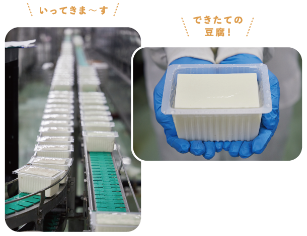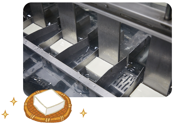 カットした豆腐は、水と一緒に容器にいれてパッキング。そのあと、中まで火が通ってしまわないよう85℃で加熱し、表面のみ殺菌します。